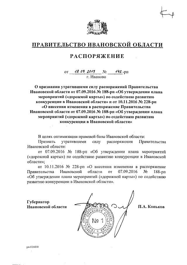 Распоряжение Правительства Ивановской области от 19.07.2017 N 142-рп "О признании утратившими силу распоряжений Правительства Ивановской области от 07.09.2016 N 188-рп "Об утверждении плана мероприятий ("дорожной карты") по содействию развитию конкуренции в Ивановской области" и от 10.11.2016 N 228-рп "О внесении изменения в распоряжение Правительства Ивановской области от 07.09.2016 N 188-рп "Об утверждении плана мероприятий ("дорожной карты") по содействию развитию конкуренции в Ивановской области"