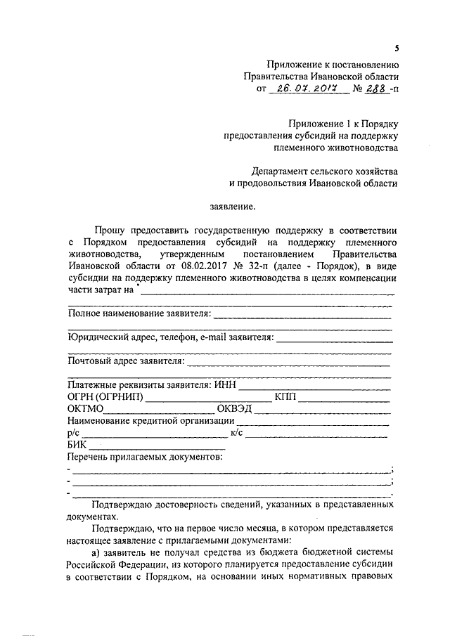 Постановление Правительства Ивановской области от 26.07.2017 N 288-п "О внесении изменений в постановление Правительства Ивановской области от 08.02.2017 N 32-п "Об утверждении Порядка предоставления субсидий на поддержку племенного животноводства"