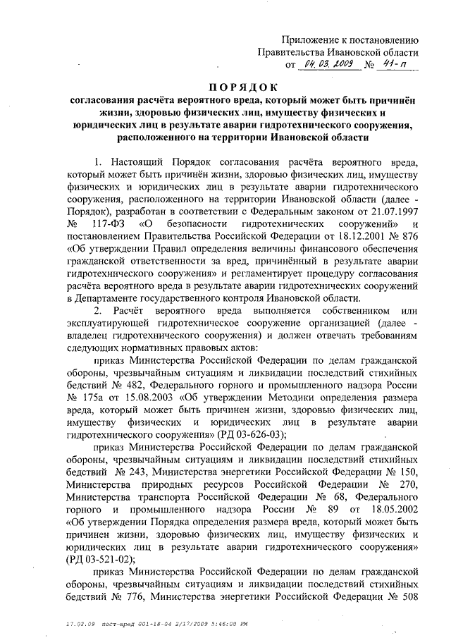 Постановление Правительства Ивановской области от 04.03.2009 N 41-п "Об утверждении Порядка согласования расчета вероятного вреда, который может быть причинен жизни, здоровью физических лиц, имуществу физических и юридических лиц в результате аварии гидротехнического сооружения, расположенного на территории Ивановской области"