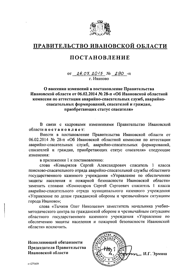 Постановление Правительства Ивановской области от 26.07.2017 N 290-п "О внесении изменений в постановление Правительства Ивановской области от 06.02.2014 N 28-п "Об Ивановской областной комиссии по аттестации аварийно-спасательных служб, аварийно-спасательных формирований, спасателей и граждан, приобретающих статус спасателя"