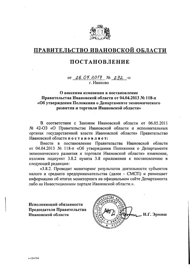 Постановление Правительства Ивановской области от 26.07.2017 N 292-п "О внесении изменения в постановление Правительства Ивановской области от 04.04.2013 N 118-п "Об утверждении Положения о Департаменте экономического развития и торговли Ивановской области"