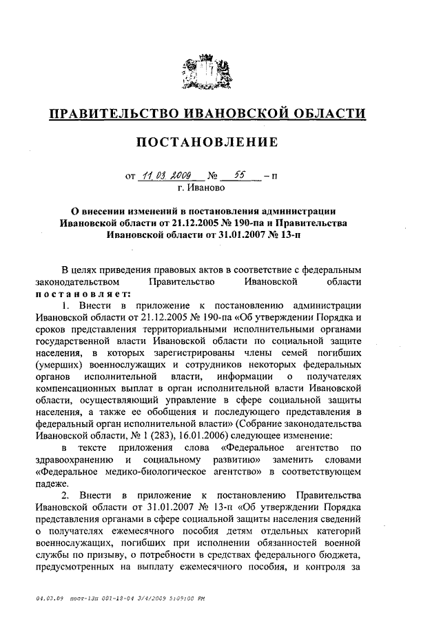 Постановление Правительства Ивановской области от 11.03.2009 N 55-п "О внесении изменений в постановления администрации Ивановской области от 21.12.2005 N 190-па и Правительства Ивановской области от 31.01.2007 N 13-п"