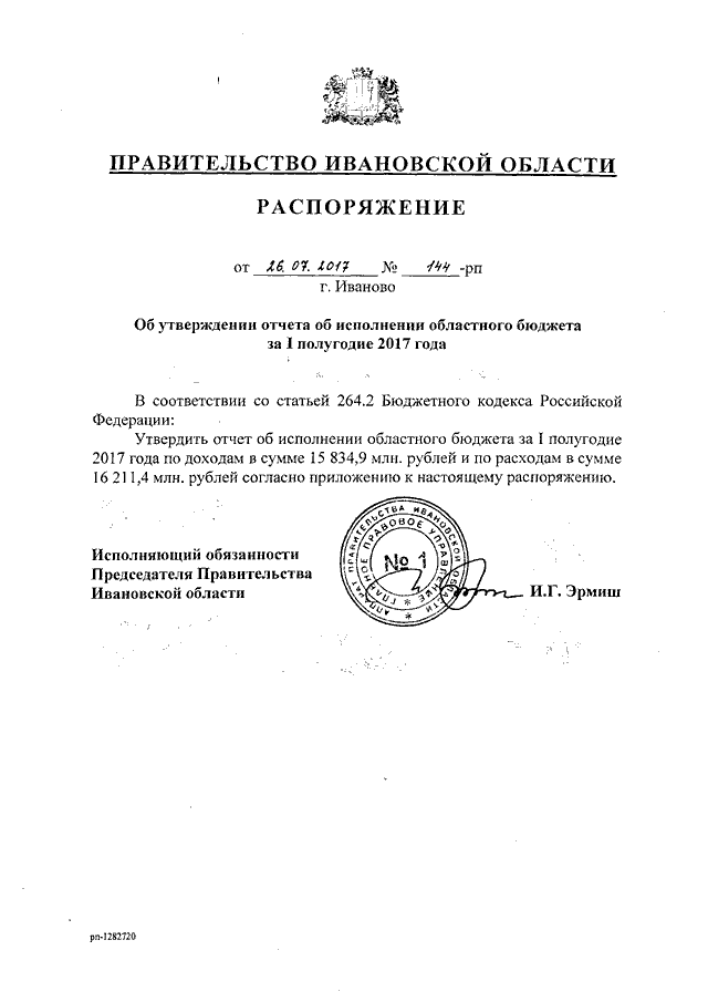 Распоряжение Правительства Ивановской области от 26.07.2017 N 144-рп "Об утверждении отчета об исполнении областного бюджета за I полугодие 2017 года"