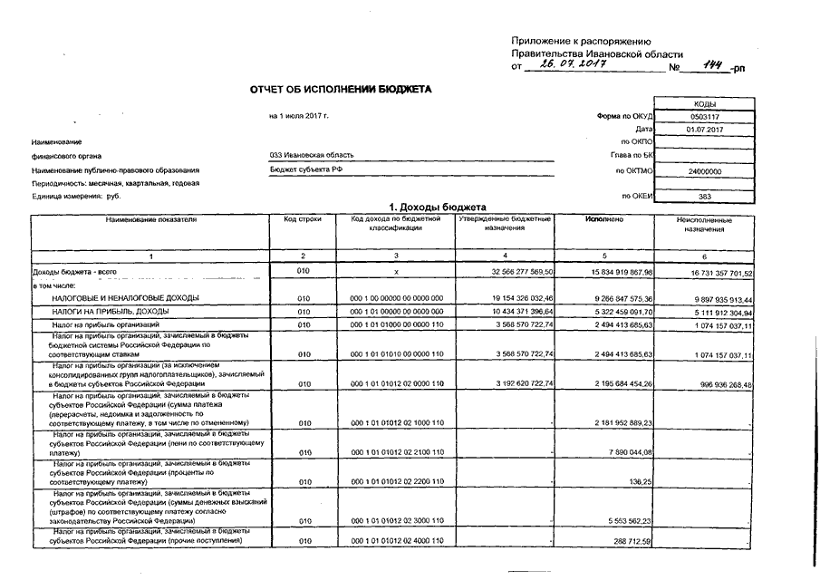 Распоряжение Правительства Ивановской области от 26.07.2017 N 144-рп "Об утверждении отчета об исполнении областного бюджета за I полугодие 2017 года"