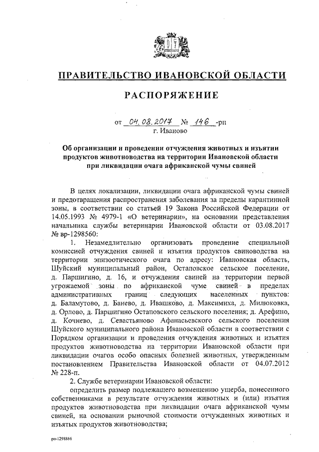 Распоряжение Правительства Ивановской области от 04.08.2017 N 146-рп "Об организации и проведении отчуждения животных и изъятии продуктов животноводства на территории Ивановской области при ликвидации очага африканской чумы свиней"