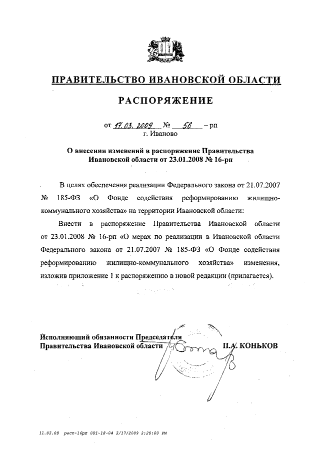 Распоряжение Правительства Ивановской области от 17.03.2009 N 56-рп "О внесении изменений в распоряжение Правительства Ивановской области от 23.01.2008 N 16-рп"