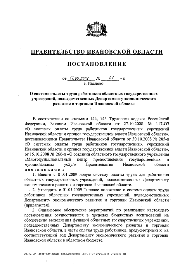 Постановление Правительства Ивановской области от 17.03.2009 N 61-п "О системе оплаты труда работников областных государственных учреждений, подведомственных Департаменту экономического развития и торговли Ивановской области" (вместе с "Типовым положением о системе оплаты труда работников областных государственных учреждений, подведомственных Департаменту экономического развития и торговли Ивановской области")