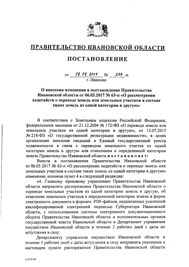 Постановление Правительства Ивановской области от 08.08.2017 N 299-п "О внесении изменения в постановление Правительства Ивановской области от 06.03.2017 N 63-п "О рассмотрении ходатайств о переводе земель или земельных участков в составе таких земель из одной категории в другую"
