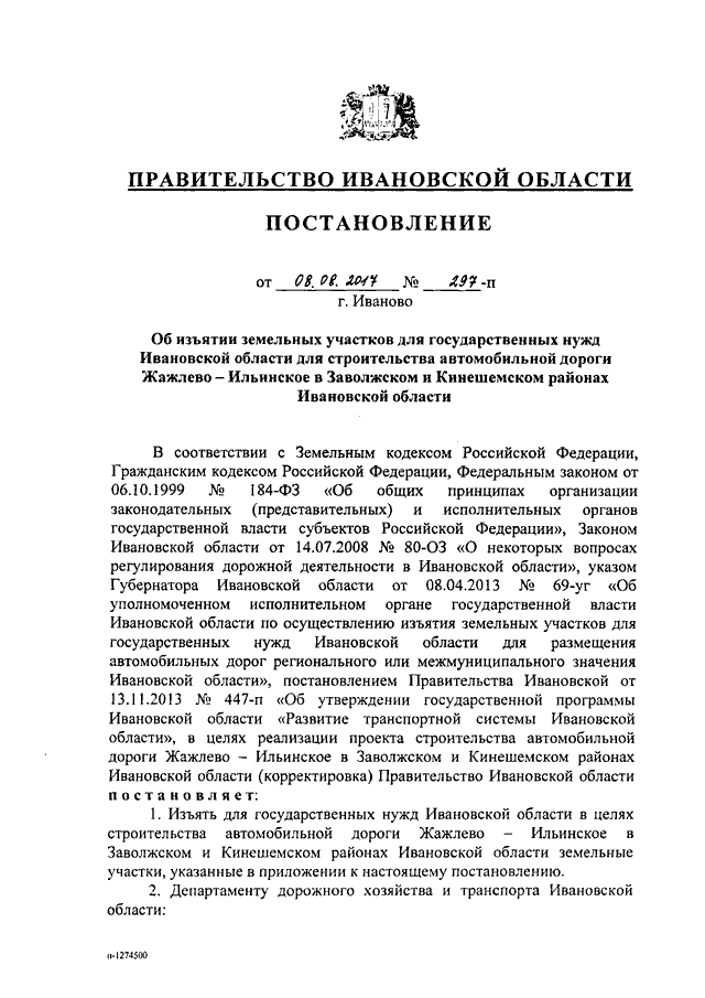 Постановление Правительства Ивановской области от 08.08.2017 N 297-п "Об изъятии земельных участков для государственных нужд Ивановской области для строительства автомобильной дороги Жажлево - Ильинское в Заволжском и Кинешемском районах Ивановской области"