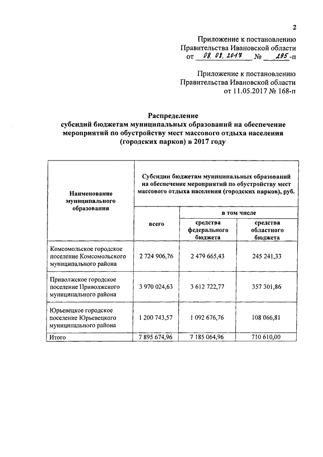 Постановление Правительства Ивановской области от 08.08.2017 N 295-п "О внесении изменения в постановление Правительства Ивановской области от 11.05.2017 N 168-п "О распределении субсидий бюджетам муниципальных образований на обеспечение мероприятий по обустройству мест массового отдыха населения (городских парков) в 2017 году"