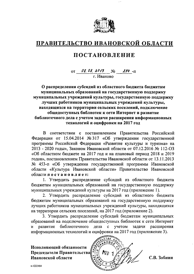 Постановление Правительства Ивановской области от 08.08.2017 N 294-п "О распределении субсидий из областного бюджета бюджетам муниципальных образований на государственную поддержку муниципальных учреждений культуры, государственную поддержку лучших работников муниципальных учреждений культуры, находящихся на территории сельских поселений, подключение общедоступных библиотек к сети Интернет и развитие библиотечного дела с учетом задачи расширения информационных технологий и оцифровки на 2017 год"