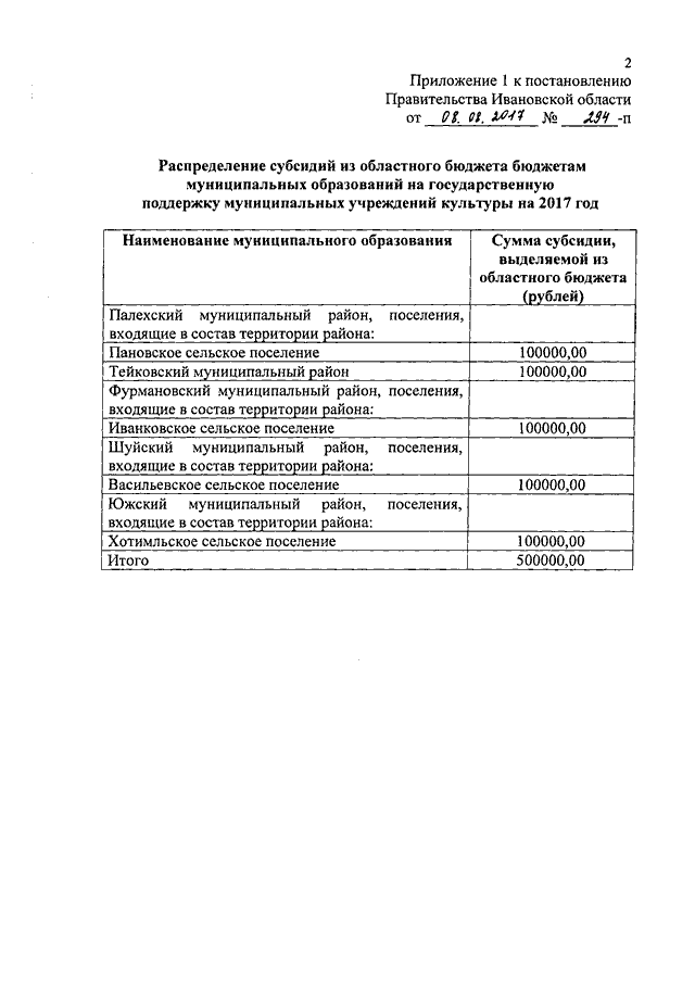 Постановление Правительства Ивановской области от 08.08.2017 N 294-п "О распределении субсидий из областного бюджета бюджетам муниципальных образований на государственную поддержку муниципальных учреждений культуры, государственную поддержку лучших работников муниципальных учреждений культуры, находящихся на территории сельских поселений, подключение общедоступных библиотек к сети Интернет и развитие библиотечного дела с учетом задачи расширения информационных технологий и оцифровки на 2017 год"