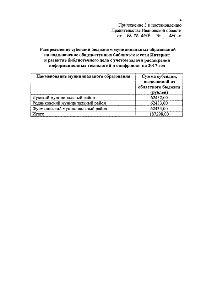 Постановление Правительства Ивановской области от 08.08.2017 N 294-п "О распределении субсидий из областного бюджета бюджетам муниципальных образований на государственную поддержку муниципальных учреждений культуры, государственную поддержку лучших работников муниципальных учреждений культуры, находящихся на территории сельских поселений, подключение общедоступных библиотек к сети Интернет и развитие библиотечного дела с учетом задачи расширения информационных технологий и оцифровки на 2017 год"