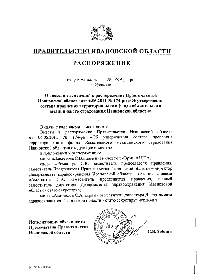 Распоряжение Правительства Ивановской области от 08.08.2017 N 149-рп "О внесении изменений в распоряжение Правительства Ивановской области от 06.06.2011 N 174-рп "Об утверждении состава правления территориального фонда обязательного медицинского страхования Ивановской области"