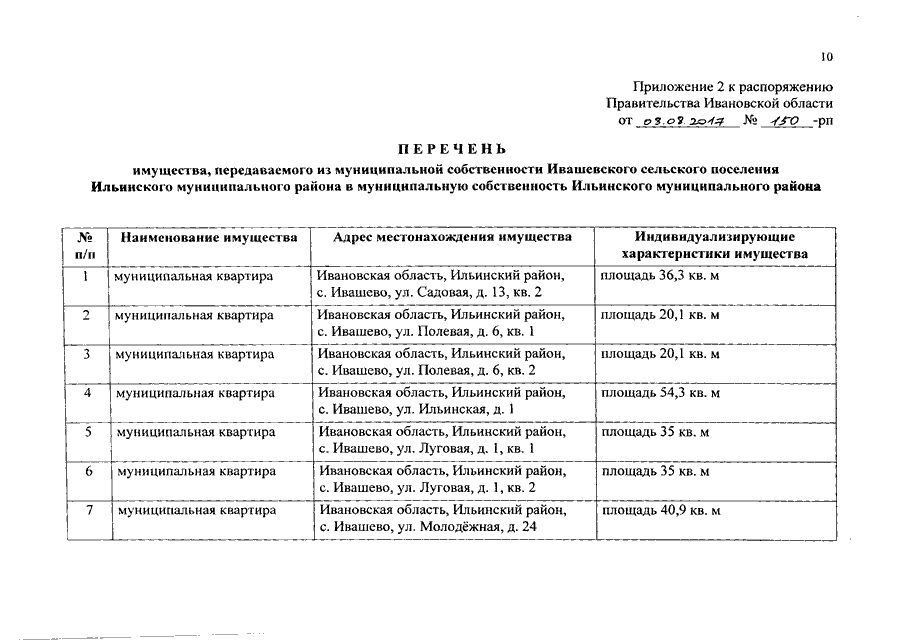 Распоряжение Правительства Ивановской области от 08.08.2017 N 150-рп "О разграничении имущества, находящегося в муниципальной собственности, между Ильинским муниципальным районом и сельскими поселениями, входящими в его состав, в связи с изменением перечня вопросов местного значения сельского поселения"