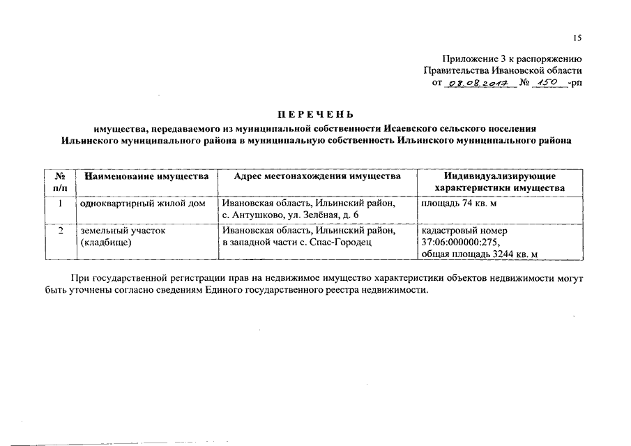 Распоряжение Правительства Ивановской области от 08.08.2017 N 150-рп "О разграничении имущества, находящегося в муниципальной собственности, между Ильинским муниципальным районом и сельскими поселениями, входящими в его состав, в связи с изменением перечня вопросов местного значения сельского поселения"
