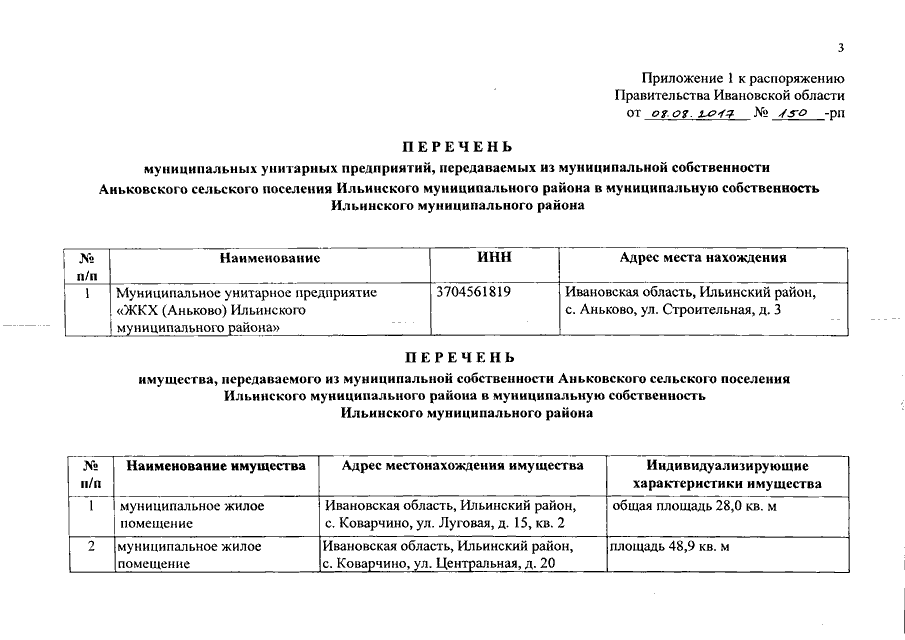 Распоряжение Правительства Ивановской области от 08.08.2017 N 150-рп "О разграничении имущества, находящегося в муниципальной собственности, между Ильинским муниципальным районом и сельскими поселениями, входящими в его состав, в связи с изменением перечня вопросов местного значения сельского поселения"