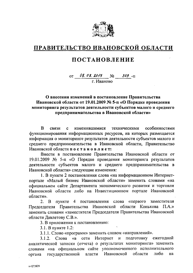 Постановление Правительства Ивановской области от 08.08.2017 N 309-п "О внесении изменений в постановление Правительства Ивановской области от 19.01.2009 N 5-п "О Порядке проведения мониторинга результатов деятельности субъектов малого и среднего предпринимательства в Ивановской области"