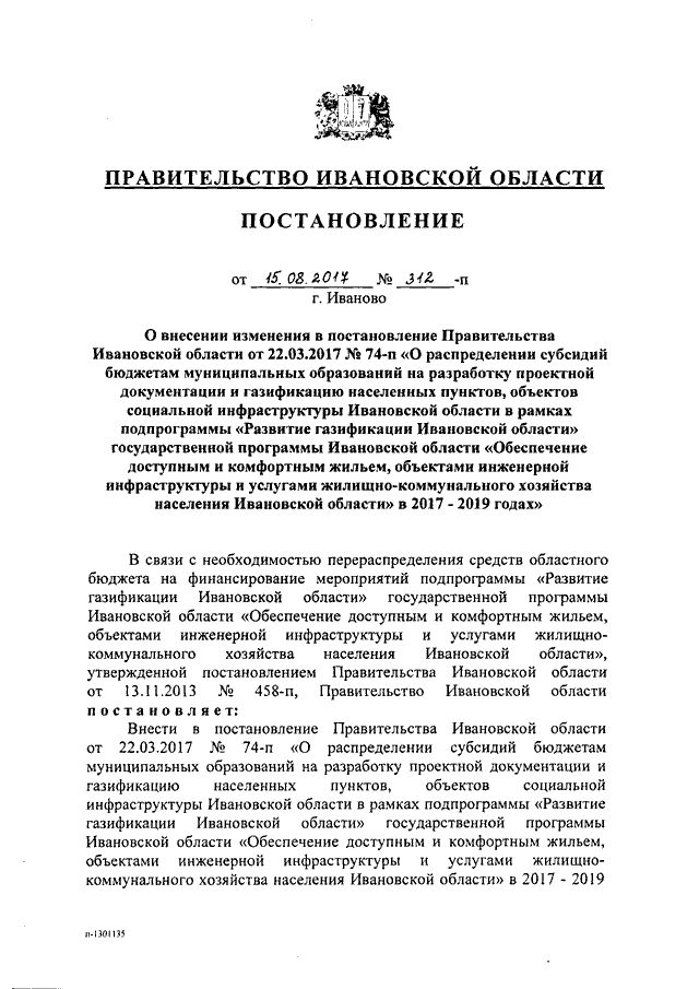 Постановление Правительства Ивановской области от 15.08.2017 N 312-п "О внесении изменения в постановление Правительства Ивановской области от 22.03.2017 N 74-п "О распределении субсидий бюджетам муниципальных образований на разработку проектной документации и газификацию населенных пунктов, объектов социальной инфраструктуры Ивановской области в рамках подпрограммы "Развитие газификации Ивановской области" государственной программы Ивановской области "Обеспечение доступным и комфортным жильем, объектами инженерной инфраструктуры и услугами жилищно-коммунального хозяйства населения Ивановской области" в 2017 - 2019 годах"