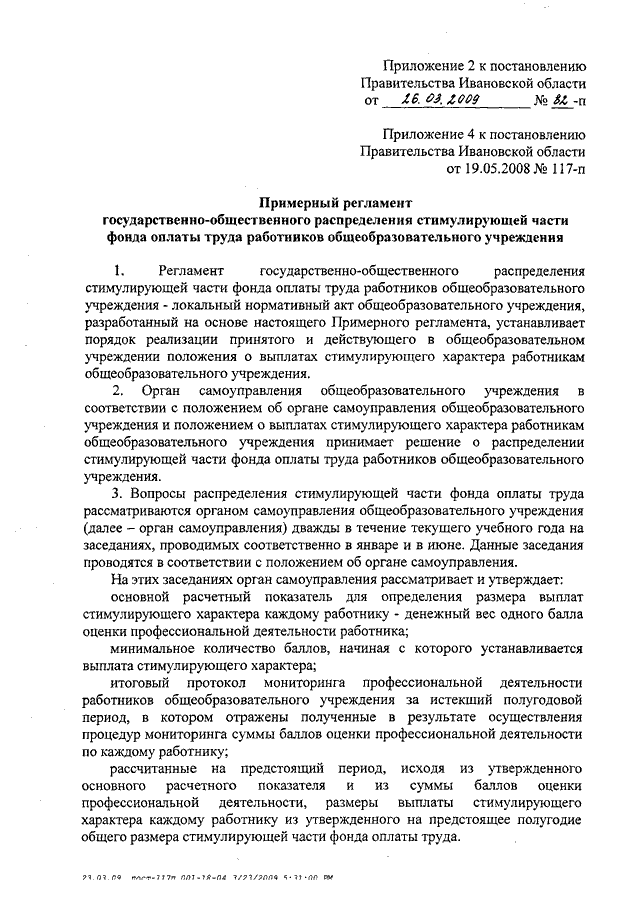 Постановление Правительства Ивановской области от 26.03.2009 N 82-п "О внесении изменений и дополнений в постановление Правительства Ивановской области от 19.05.2008 N 117-п и признании утратившими силу отдельных постановлений Правительства Ивановской области" (вместе с "Примерным регламентом государственно-общественного распределения стимулирующей части фонда оплаты труда работников общеобразовательного учреждения", "Примерным положением об органе самоуправления общеобразовательного учреждения")