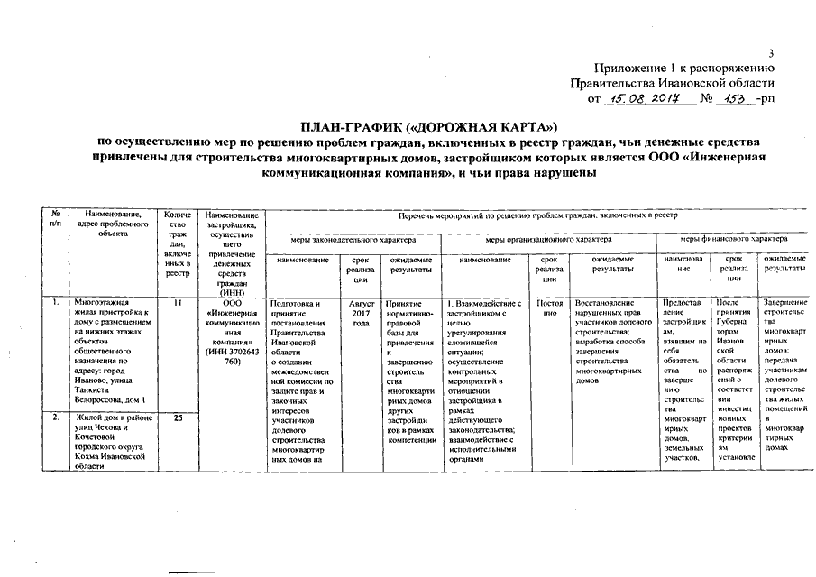 Распоряжение Правительства Ивановской области от 15.08.2017 N 153-рп "Об утверждении планов-графиков ("дорожных карт") по осуществлению мер по решению проблем граждан, включенных в реестр граждан, чьи денежные средства привлечены для строительства многоквартирных домов и чьи права нарушены" (вместе с "Планом-графиком ("дорожной картой") по осуществлению мер по решению проблем граждан, включенных в реестр граждан, чьи денежные средства привлечены для строительства многоквартирных домов, застройщиком которых является ООО "Инженерная коммуникационная компания", и чьи права нарушены", "Планом-графиком ("дорожной картой") по осуществлению мер по решению проблем граждан, включенных в реестр граждан, чьи денежные средства привлечены для строительства многоквартирного дома, застройщиком которого является ООО "Производственно-коммерческая фирма "Пума", и чьи права нарушены", "Планом-графиком ("дорожной картой") по осуществлению мер по решению проблем граждан, включенных в реестр граждан, чьи денежные средства привлечены для строительства многоквартирного дома, застройщиком которого является ООО "Ивстройинвест", и чьи права нарушены", "Планом-графиком ("дорожной картой") по осуществлению мер по решению проблем граждан, включенных в реестр граждан, чьи денежные средства привлечены для строительства многоквартирных домов, застройщиком которых является ОАО "ДСК", и чьи права нарушены")