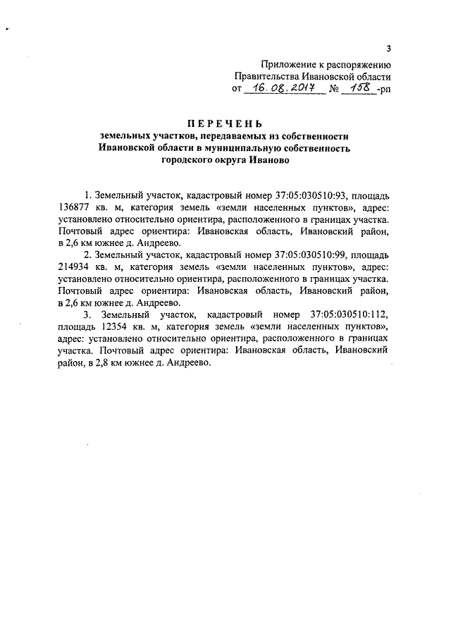 Распоряжение Правительства Ивановской области от 16.08.2017 N 158-рп "О передаче земельных участков из собственности Ивановской области в муниципальную собственность городского округа Иваново"