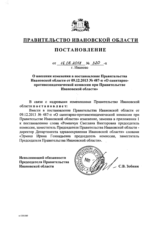 Постановление Правительства Ивановской области от 16.08.2017 N 320-п "О внесении изменения в постановление Правительства Ивановской области от 09.12.2013 N 487-п "О санитарно-противоэпидемической комиссии при Правительстве Ивановской области"