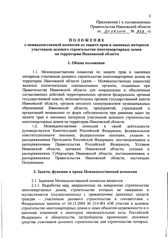 Постановление Правительства Ивановской области от 24.08.2017 N 323-п "О создании межведомственной комиссии по защите прав и законных интересов участников долевого строительства многоквартирных домов на территории Ивановской области" (вместе с "Положением о межведомственной комиссии по защите прав и законных интересов участников долевого строительства многоквартирных домов на территории Ивановской области")