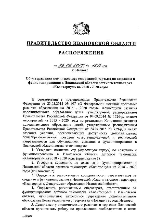 Распоряжение Правительства Ивановской области от 23.08.2017 N 160-рп "Об утверждении комплекса мер ("дорожной карты") по созданию и функционированию в Ивановской области детского технопарка "Кванториум" на 2018 - 2020 годы" (вместе с "Концепцией по созданию и функционированию в Ивановской области детского технопарка "Кванториум" на 2018 - 2020 годы")