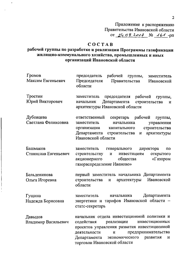 Распоряжение Правительства Ивановской области от 24.08.2017 N 161-рп "О создании рабочей группы по разработке и реализации Программы газификации жилищно-коммунального хозяйства, промышленных и иных организаций Ивановской области"