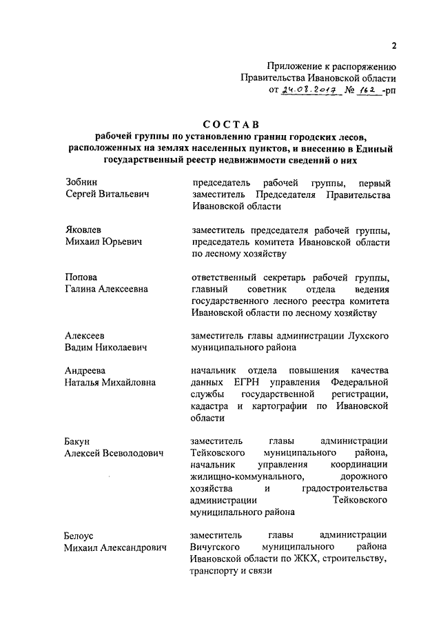 Распоряжение Правительства Ивановской области от 24.08.2017 N 162-рп "О создании рабочей группы по установлению границ городских лесов, расположенных на землях населенных пунктов, и внесению в Единый государственный реестр недвижимости сведений о них"