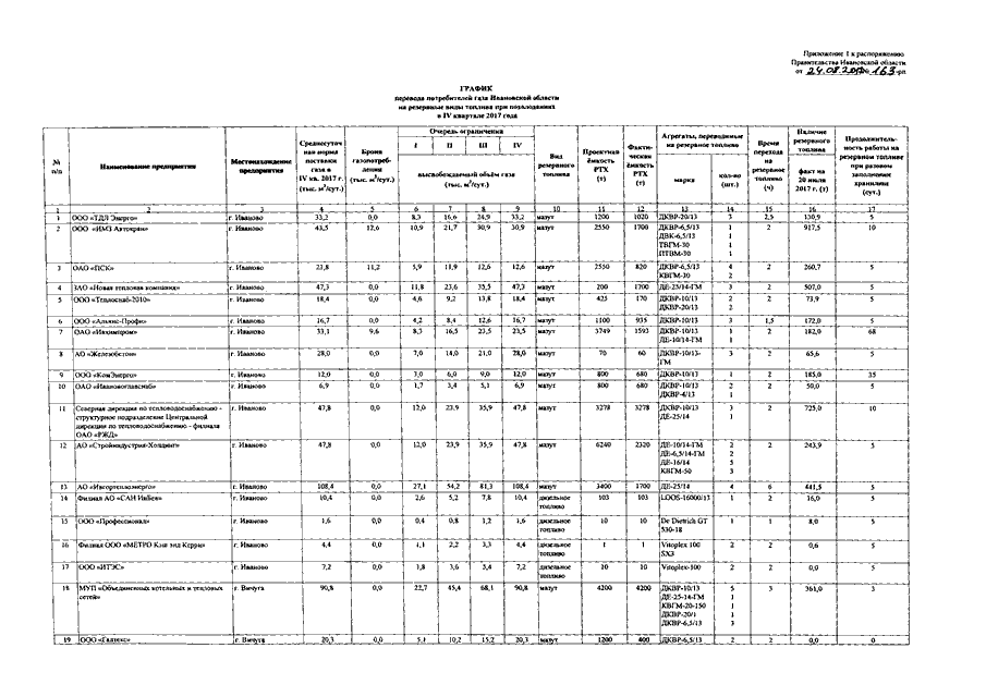 Распоряжение Правительства Ивановской области от 24.08.2017 N 163-рп "Об утверждении графиков перевода потребителей газа Ивановской области на резервные виды топлива при похолоданиях в IV квартале 2017 года и ограничения снабжения газом покупателей Ивановской области и очередности их отключения в случае нарушения технологического режима работы газотранспортной системы при аварии в IV квартале 2017 года"
