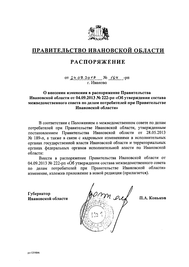 Распоряжение Правительства Ивановской области от 24.08.2017 N 164-рп "О внесении изменения в распоряжение Правительства Ивановской области от 04.09.2013 N 222-рп "Об утверждении состава межведомственного совета по делам потребителей при Правительстве Ивановской области"