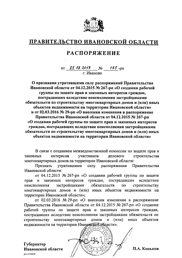 Распоряжение Правительства Ивановской области от 25.08.2017 N 165-рп "О признании утратившими силу распоряжений Правительства Ивановской области от 04.12.2015 N 267-рп "О создании рабочей группы по защите прав и законных интересов граждан, пострадавших вследствие неисполнения застройщиками обязательств по строительству многоквартирных домов и (или) иных объектов недвижимости на территории Ивановской области" и от 02.03.2016 N 29-рп "О внесении изменения в распоряжение Правительства Ивановской области от 04.12.2015 N 267-рп "О создании рабочей группы по защите прав и законных интересов граждан, пострадавших вследствие неисполнения застройщиками обязательств по строительству многоквартирных домов и (или) иных объектов недвижимости на территории Ивановской области"
