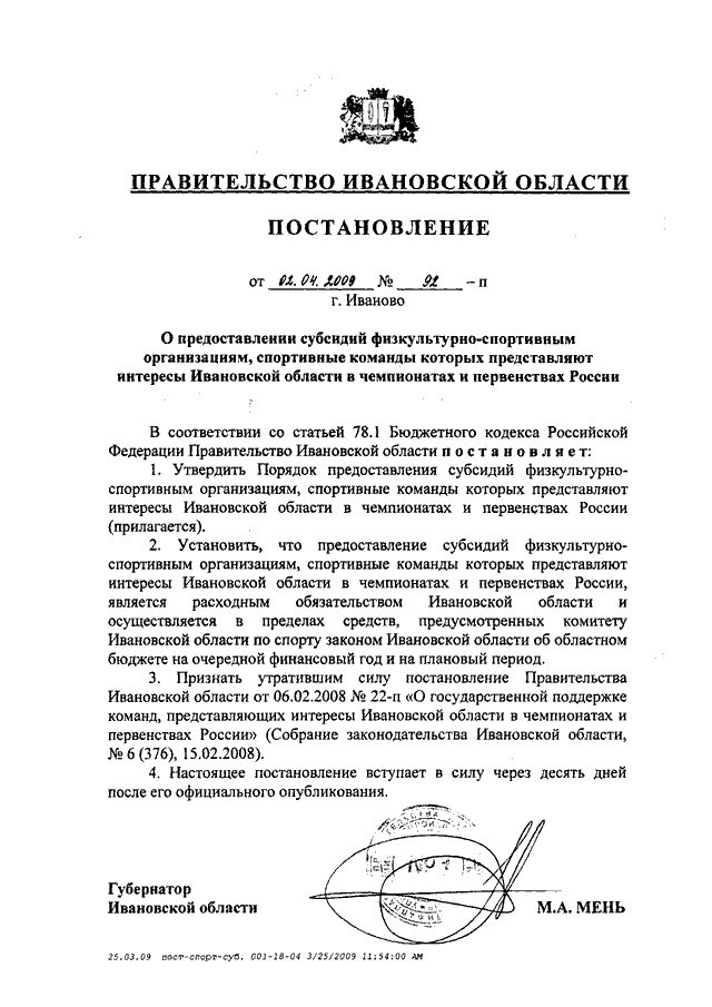 Постановление Правительства Ивановской области от 02.04.2009 N 92-п "О предоставлении субсидий физкультурно-спортивным организациям, спортивные команды которых представляют интересы Ивановской области в чемпионатах и первенствах России" (вместе с "Порядком предоставления субсидий физкультурно-спортивным организациям, спортивные команды которых представляют интересы Ивановской области в чемпионатах и первенствах России")
