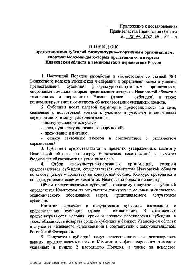 Постановление Правительства Ивановской области от 02.04.2009 N 92-п "О предоставлении субсидий физкультурно-спортивным организациям, спортивные команды которых представляют интересы Ивановской области в чемпионатах и первенствах России" (вместе с "Порядком предоставления субсидий физкультурно-спортивным организациям, спортивные команды которых представляют интересы Ивановской области в чемпионатах и первенствах России")