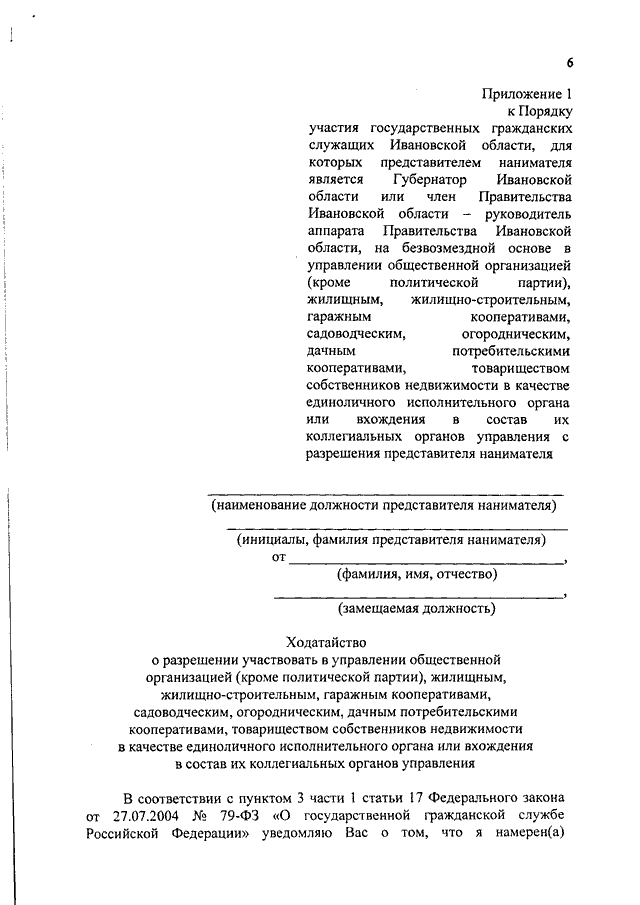 Постановление Правительства Ивановской области от 24.08.2017 N 333-п "Об утверждении Порядка участия государственных гражданских служащих Ивановской области, для которых представителем нанимателя является Губернатор Ивановской области или член Правительства Ивановской области - руководитель аппарата Правительства Ивановской области, на безвозмездной основе в управлении общественной организацией (кроме политической партии), жилищным, жилищно-строительным, гаражным кооперативами, садоводческим, огородническим, дачным потребительскими кооперативами, товариществом собственников недвижимости в качестве единоличного исполнительного органа или вхождения в состав их коллегиальных органов управления с разрешения представителя нанимателя"