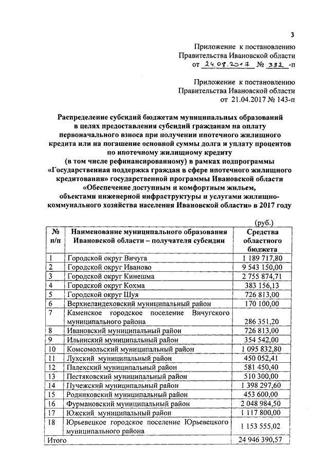 Постановление Правительства Ивановской области от 24.08.2017 N 332-п "О внесении изменений в постановление Правительства Ивановской области от 21.04.2017 N 143-п "О распределении субсидий бюджетам муниципальных образований в целях предоставления субсидий гражданам на оплату первоначального взноса при получении ипотечного жилищного кредита или на погашение основной суммы долга и уплату процентов по ипотечному жилищному кредиту (в том числе рефинансированному) в рамках подпрограммы "Государственная поддержка граждан в сфере ипотечного жилищного кредитования" государственной программы Ивановской области "Обеспечение доступным и комфортным жильем, объектами инженерной инфраструктуры и услугами жилищно-коммунального хозяйства населения Ивановской области" в 2017 году"