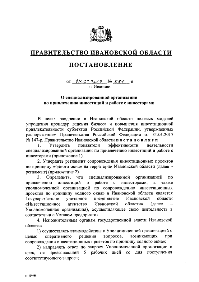 Постановление Правительства Ивановской области от 24.08.2017 N 331-п "О специализированной организации по привлечению инвестиций и работе с инвесторами" (вместе с "Регламентом сопровождения инвестиционных проектов по принципу "одного окна" на территории Ивановской области")