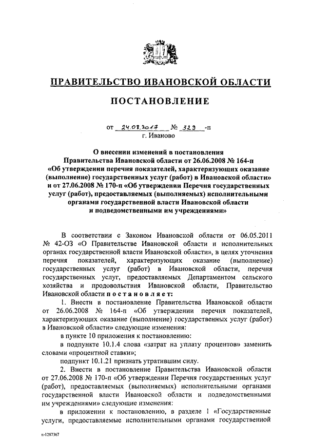 Постановление Правительства Ивановской области от 24.08.2017 N 329-п "О внесении изменений в постановления Правительства Ивановской области от 26.06.2008 N 164-п "Об утверждении перечня показателей, характеризующих оказание (выполнение) государственных услуг (работ) в Ивановской области" и от 27.06.2008 N 170-п "Об утверждении Перечня государственных услуг (работ), предоставляемых (выполняемых) исполнительными органами государственной власти Ивановской области и подведомственными им учреждениями"