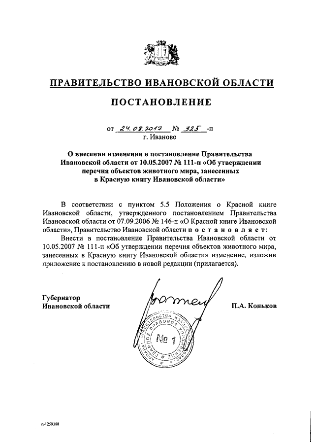 Постановление Правительства Ивановской области от 24.08.2017 N 325-п "О внесении изменения в постановление Правительства Ивановской области от 10.05.2007 N 111-п "Об утверждении перечня объектов животного мира, занесенных в Красную книгу Ивановской области"