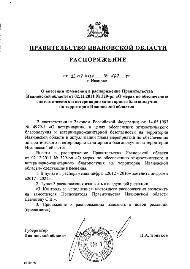 Распоряжение Правительства Ивановской области от 29.08.2017 N 167-рп "О внесении изменений в распоряжение Правительства Ивановской области от 02.12.2011 N 329-рп "О мерах по обеспечению эпизоотического и ветеринарно-санитарного благополучия на территории Ивановской области" (вместе с "Планом мероприятий по обеспечению эпизоотического и ветеринарно-санитарного благополучия на территории Ивановской области на 2017 - 2021 годы")