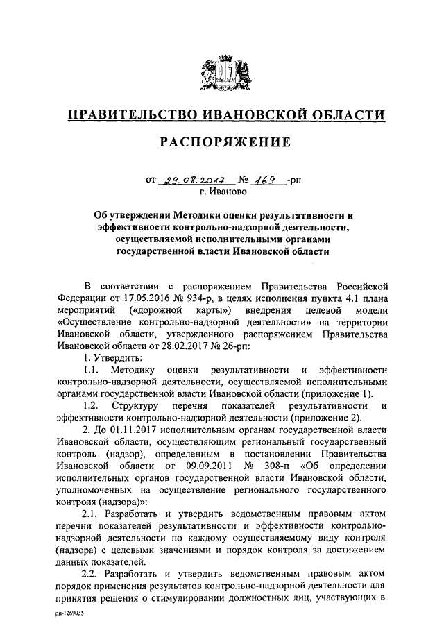 Распоряжение Правительства Ивановской области от 29.08.2017 N 169-рп "Об утверждении Методики оценки результативности и эффективности контрольно-надзорной деятельности, осуществляемой исполнительными органами государственной власти Ивановской области"
