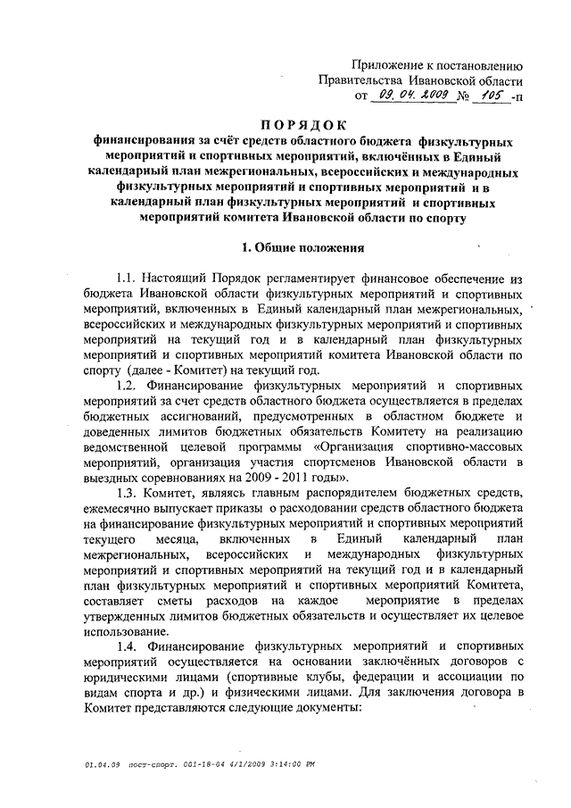 Постановление Правительства Ивановской области от 09.04.2009 N 105-п "О Порядке финансирования за счет средств областного бюджета физкультурных мероприятий и спортивных мероприятий, включенных в Единый календарный план межрегиональных, всероссийских и международных физкультурных мероприятий и спортивных мероприятий и в календарный план физкультурных мероприятий и спортивных мероприятий комитета Ивановской области по спорту"
