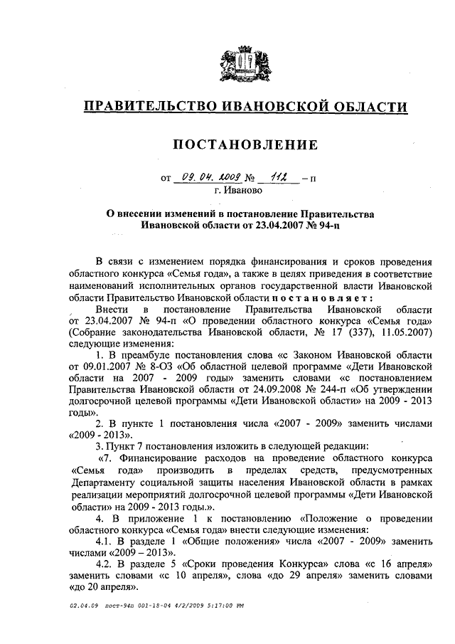 Постановление Правительства Ивановской области от 09.04.2009 N 112-п "О внесении изменений в постановление Правительства Ивановской области от 23.04.2007 N 94-п"