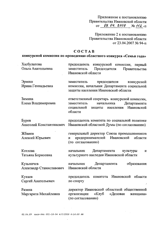 Постановление Правительства Ивановской области от 09.04.2009 N 112-п "О внесении изменений в постановление Правительства Ивановской области от 23.04.2007 N 94-п"