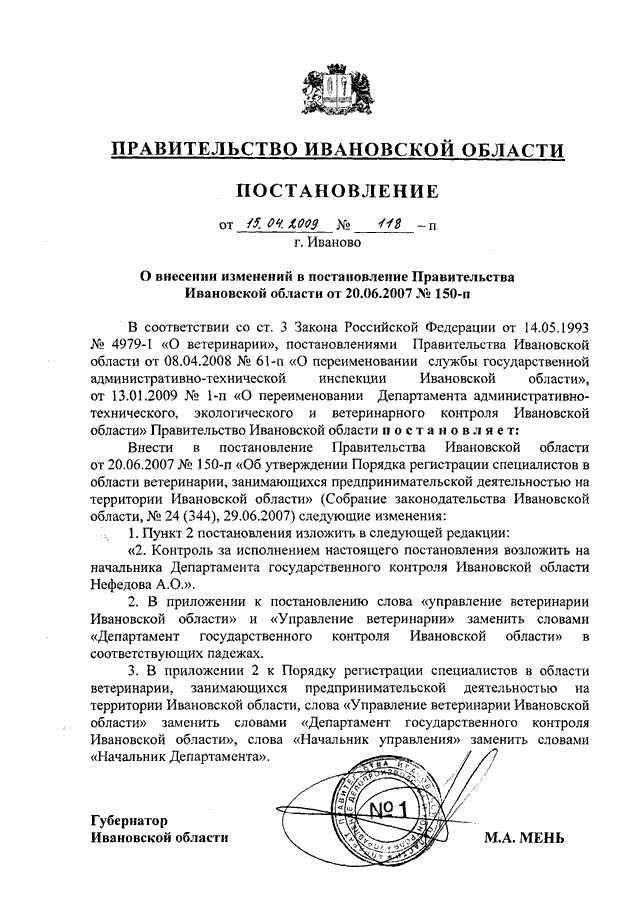 Постановление Правительства Ивановской области от 15.04.2009 N 118-п "О внесении изменений в постановление Правительства Ивановской области от 20.06.2007 N 150-п"