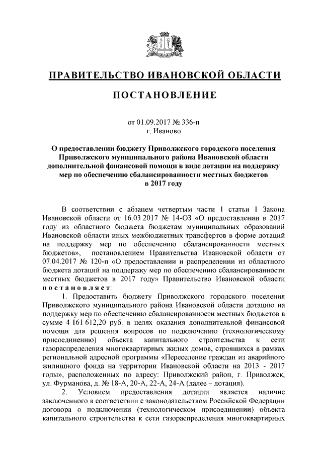 Постановление Правительства Ивановской области от 01.09.2017 N 336-п "О предоставлении бюджету Приволжского городского поселения Приволжского муниципального района Ивановской области дополнительной финансовой помощи в виде дотации на поддержку мер по обеспечению сбалансированности местных бюджетов в 2017 году"