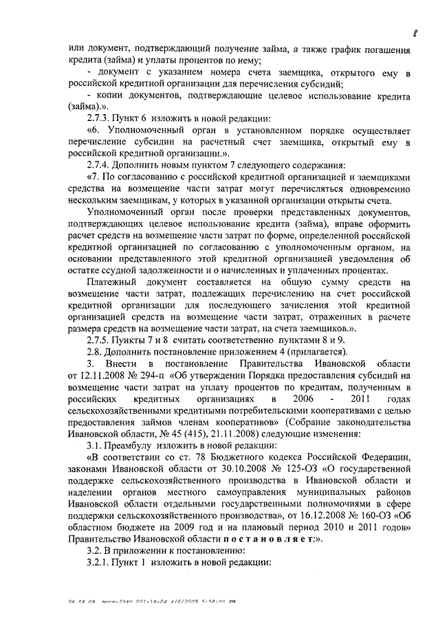 Постановление Правительства Ивановской области от 21.04.2009 N 126-п "О внесении изменений в постановления Правительства Ивановской области от 03.11.2006 N 179-п, от 13.02.2008 N 25-п, от 12.11.2008 N 294-п" (вместе с "Порядком предоставления за счет средств областного бюджета субсидий на возмещение части затрат на уплату процентов по кредитам, полученным в российских кредитных организациях в 2008 - 2011 годах на срок до 5 лет лизинговыми компаниями на пополнение оборотных средств в целях приобретения предметов лизинга для сельскохозяйственных товаропроизводителей области")