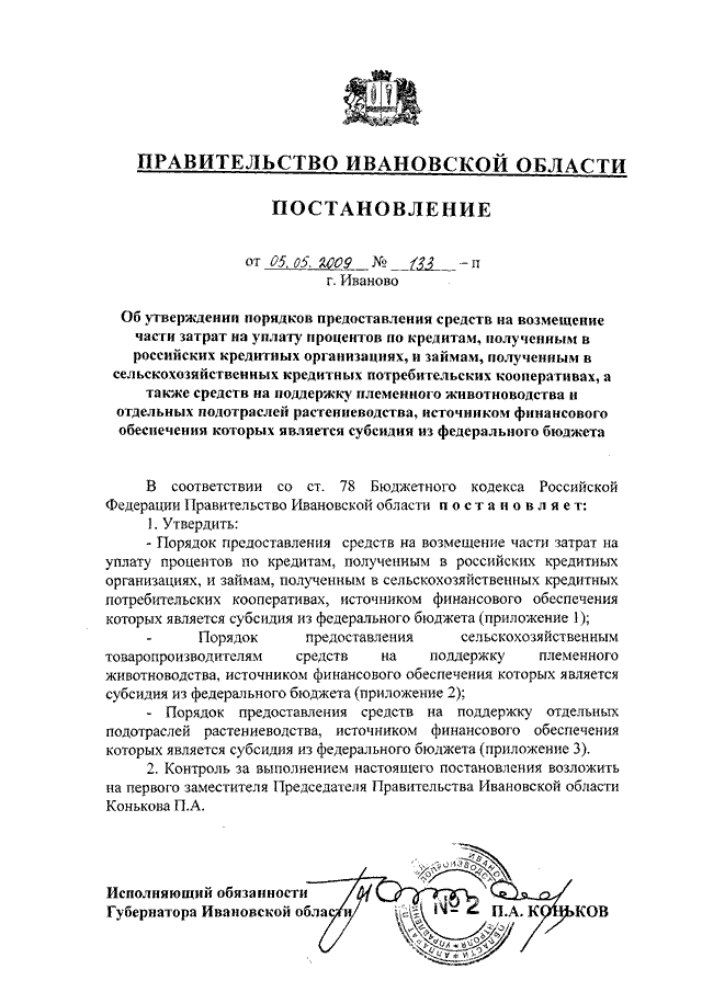 Постановление Правительства Ивановской области от 05.05.2009 N 133-п "Об утверждении порядков предоставления средств на возмещение части затрат на уплату процентов по кредитам, полученным в российских кредитных организациях, и займам, полученным в сельскохозяйственных кредитных потребительских кооперативах, а также средств на поддержку племенного животноводства и отдельных подотраслей растениеводства, источником финансового обеспечения которых является субсидия из федерального бюджета" (вместе с "Порядком предоставления сельскохозяйственным товаропроизводителям средств на поддержку племенного животноводства, источником финансового обеспечения которых является субсидия из федерального бюджета")